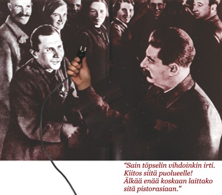Stalinin palkinnot 2011 Jo toistamiseen jaoin Stalinin palkintoja toiveena muutos parempaan. Palkituista ja myös Stalinin taustoista julkaisin pienen kuvitetun kirjan. 2016 alkaen voit tutustua siihen myös netissä. Klikkaa . Palkinnoille valikoitui jälleen ilmiöitä, jotka ovat arjen kiusana. Teemana oli aistit - jokaista aistia kohden valikoitui yksi palkittu. Voittoisia olivat mm. suihkun hanalaite, huppu, parfymoidut naiset, heiluva TV-kuva, MTV3:n sääohjelmat, pitsalaatikko, tiukat töpselit, ... Palkintojen julkistus oli Seurasaaren Kalevalakehdossa, ei Venäjän tiede- ja kulttuurikeskuksessa niin kuin olin suunnitellut. Vieraillessani keskuksessa näin monenlaisia tiloja vajaakäytössä. Lukuisiin tiedusteluihini en saanut edes kielteistä vastausta. Onko syynä keskitetty hallinto ja päätöksenteon pelko vai pelkästään kirjan aihe? Neuvostoliiton hajoamistuotteella, Venäjällä, on syytä käsitellä ja muistaa Stalinin tekoja ja aikaa. Mielestäni hankkeeni rohkaisee ymmärtämään, että asioita voi käsitellä monella tavalla. Mennyttä ei voi muuttaa, mutta siitä voi oppia. Tämän ymmärtäminen voisi olla välineenä parempaan nykyisyyteen ja tulevaisuuteen. Olen Venäjän presidentin kanssa samoilla linjoilla: vallan keskittyminen voi olla vaarallista. Palkitut pääsivät kirjaan ja saivat huomiota ja mainetta julkistustilaisuudessa. Pääpalkinnon saajaksi valikoitunut huppu, mutta perinteinen palkinto(meno)matka Siperiaan jäi tällä kertaa toteutumatta. Palkintojulkaisuja on vielä jäljellä. Mikset ostaisi yhtä omaksesi?